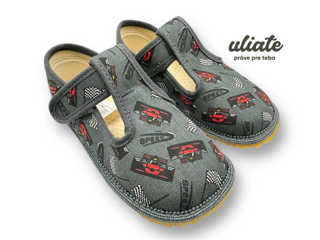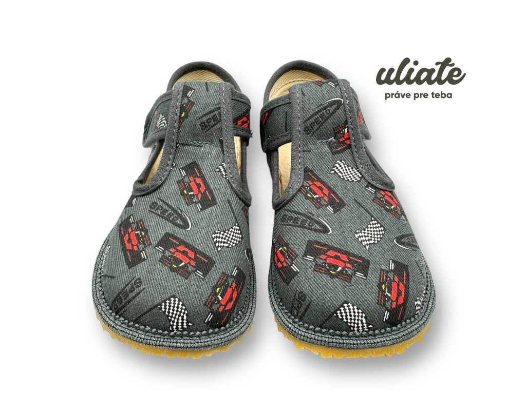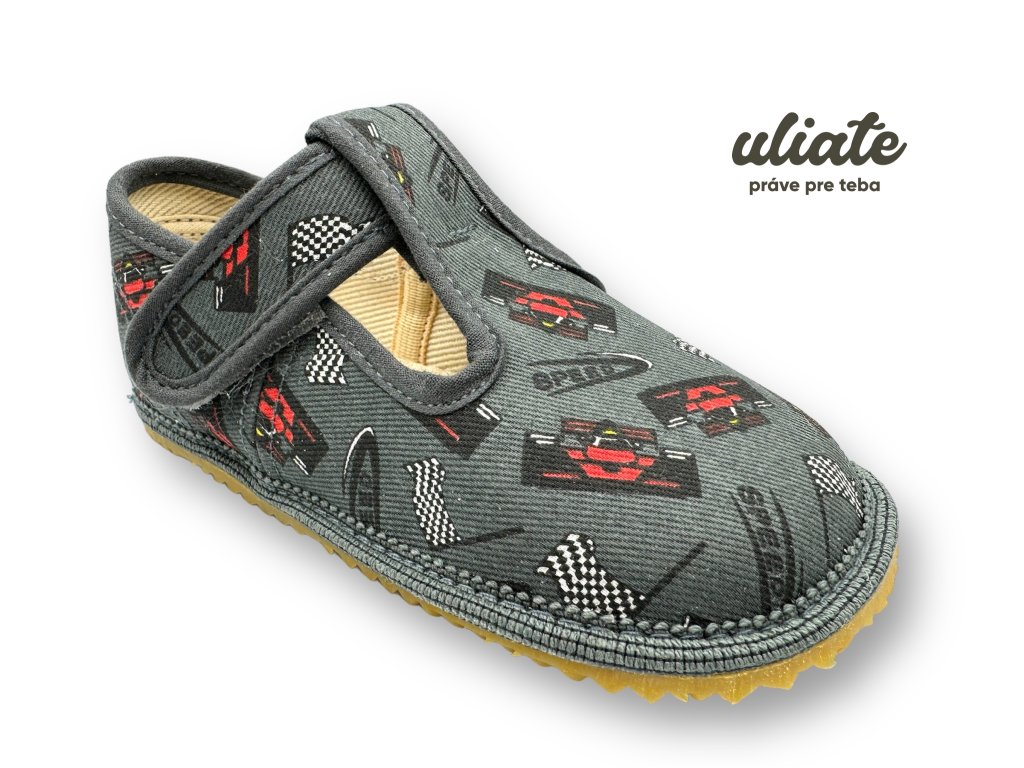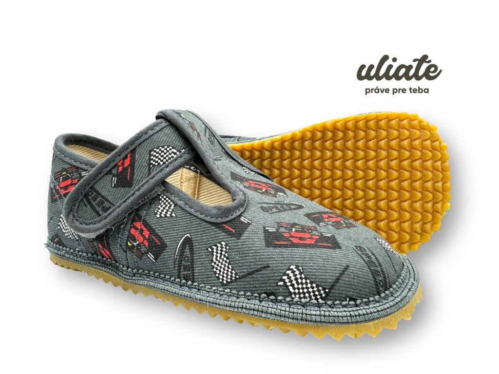 Ľahké a priedušné textilné barefoot papuče so širokou špičkou, 0 mm dropom a tenkou (~3 mm) flexibilnou gumenou podrážkou. Zapínanie na suchý zips a pohodlný strih okolo členka/päty pre istý krok v interiéri – škôlka, škola aj domov.
