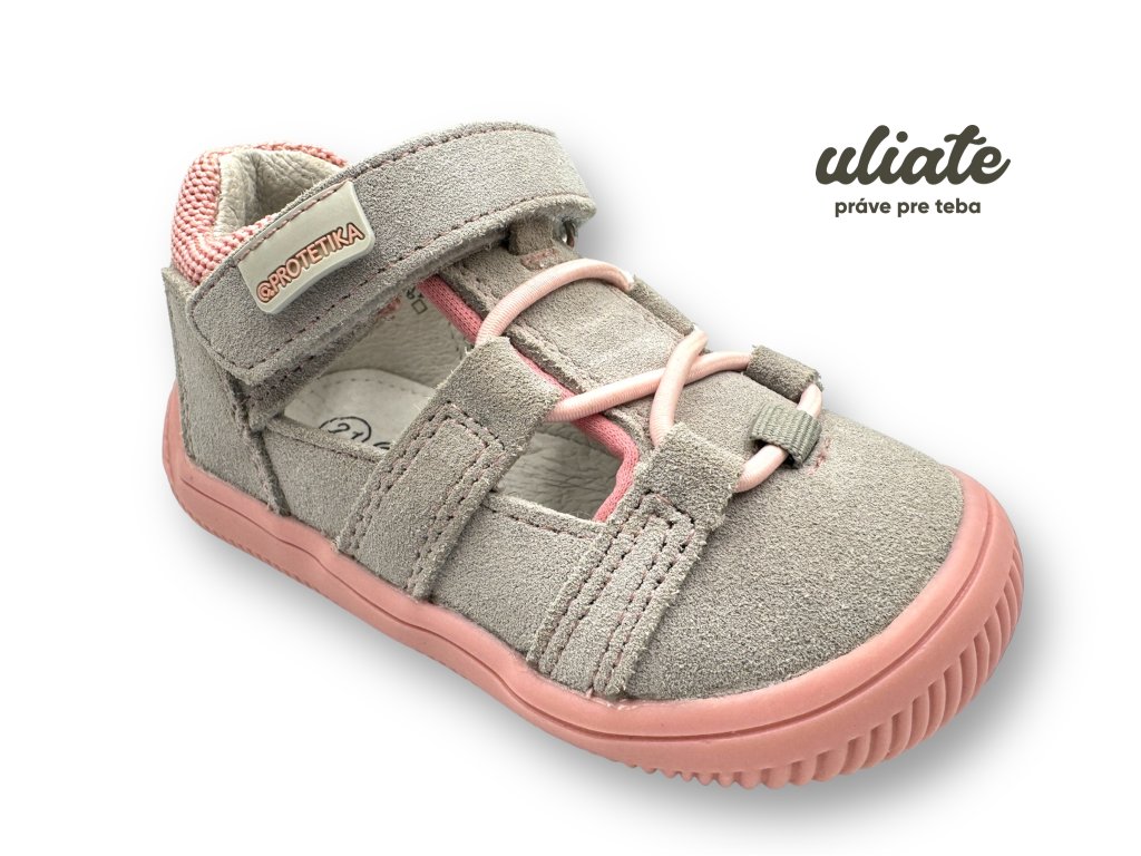 Protetika Kendy Grey: kožené barefoot sandálky s uzavretou špičkou, okopom a pružnou podrážkou. Suchý zips + gumička – letné pohodlie, čo sadne ako uliate.