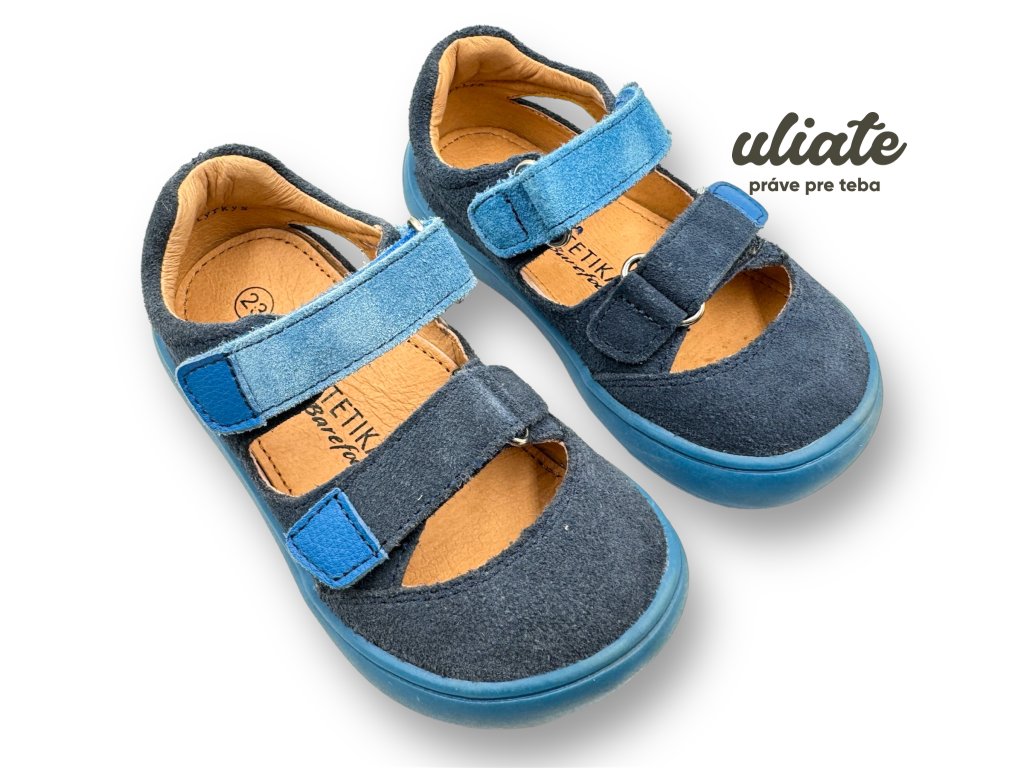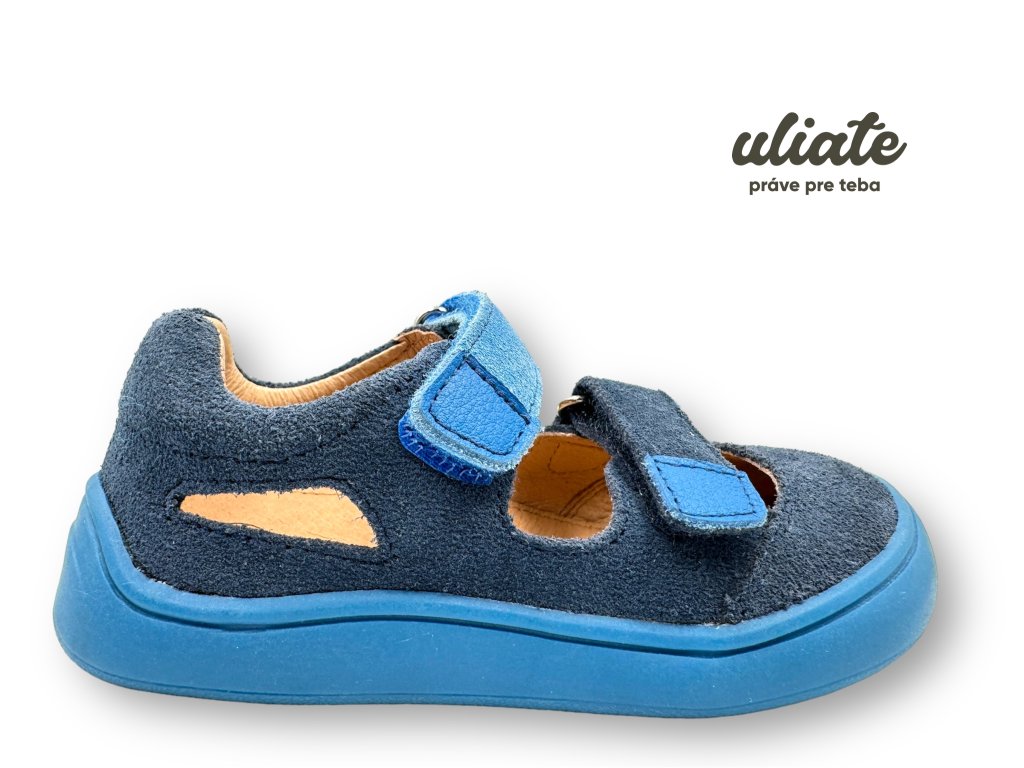 Kožené barefoot sandálky s ochranou prstov, zvýšeným okopom a veľmi ohybnou gumovou podošvou. Suchý zips + elastická gumička, nulový drop a letný komfort, ktorý deťom sadne ako uliate.