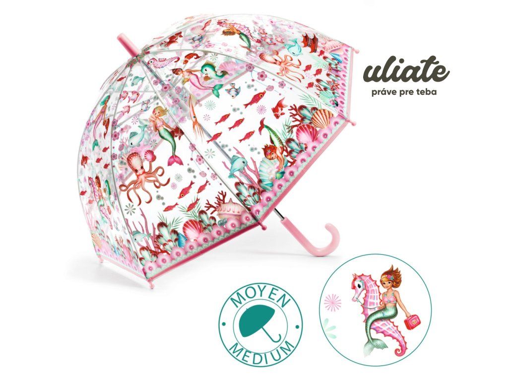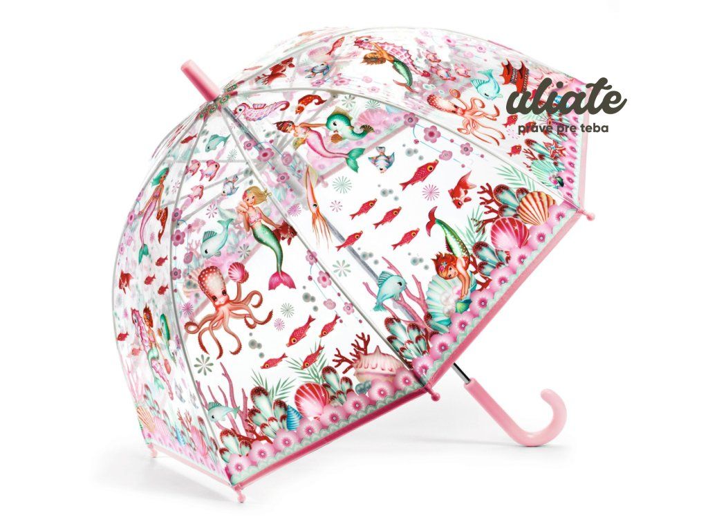 - Detský palicový dáždnik z priehľadného plastu s pôvabnými ilustráciami morských víl.