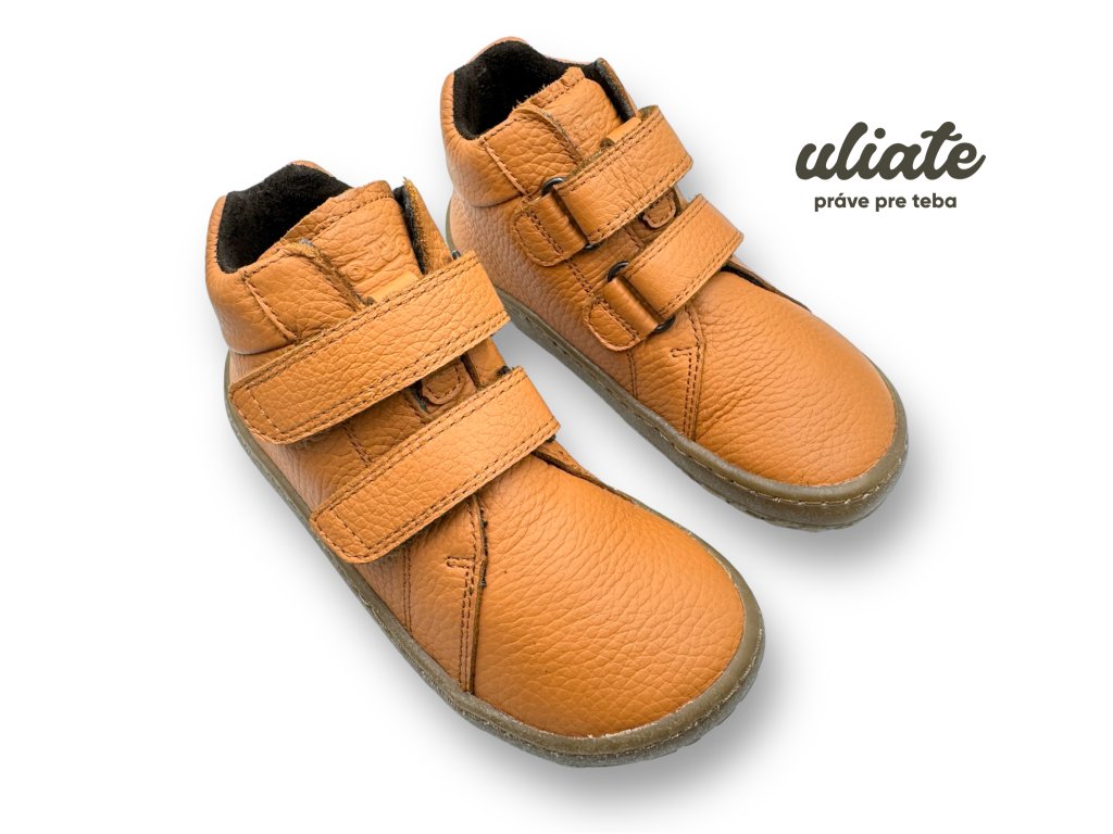Froddo Barefoot Autumn cognac – kožené celoročné barefoot topánky s mikroflísom, nulovým dropom, 2× suchým zipsom a ohybnou podrážkou.