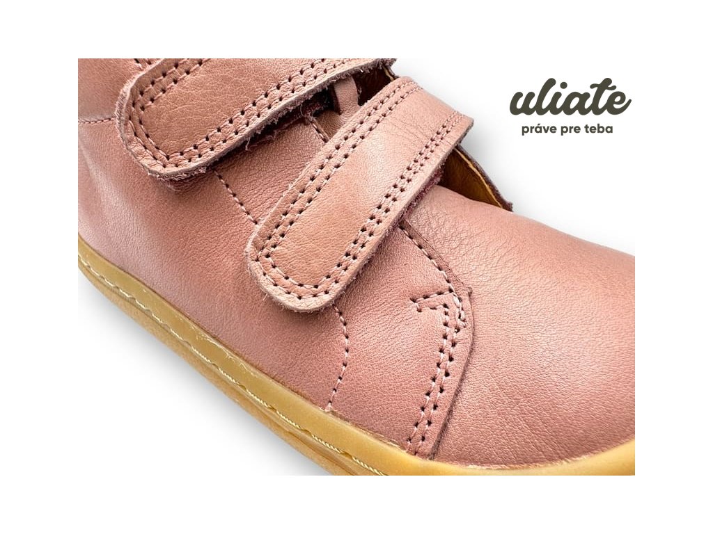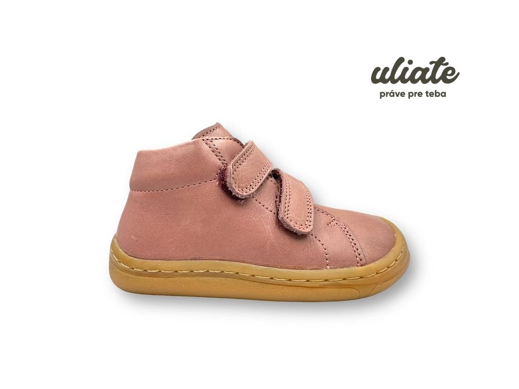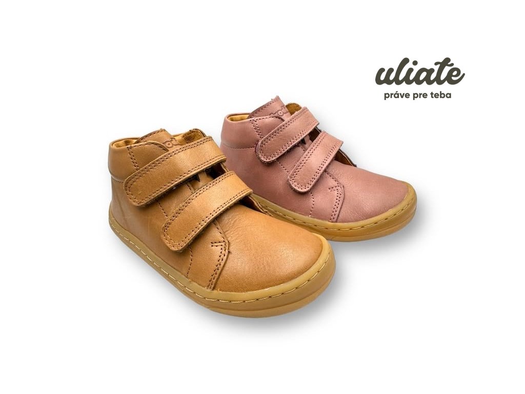 Prvé barefoot celoročky z prírodnej kože pre isté prvé krôčky: extra ohybná gumená podošva s lepším gripom, 0 mm drop, široká špička a 2× suchý zips – rýchle obúvanie a výborné dotiahnutie aj na užší členok.