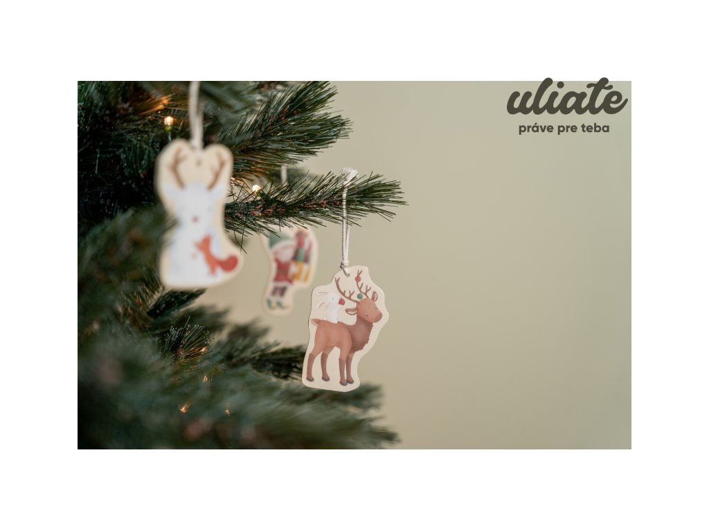 Sada 10 drevených vianočných ozdôb s maľovanými motívmi a šnúročkou na zavesenie. Krásne ozdobia stromček aj zimný kútik doma. Nie je to hračka – ide o sezónnu dekoráciu.