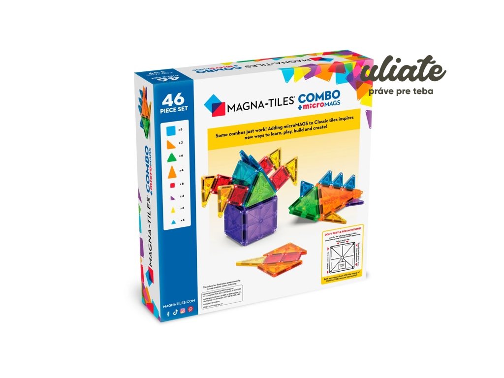Set 46 dielov kombinuje klasické Magna‑Tiles s microMAGS (o ~75 % menšie) – všetko vzájomne kompatibilné. Ideálne pre tvorbu väčších aj detailných modelov (vek 3+).
