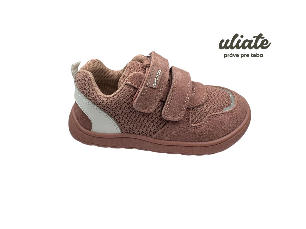 Ľahučké a priedušné mesh tenisky v odtieni Nude so 2× suchým zipsom a koženými (semiš) prvkami na špičke a bokoch pre vyššiu odolnosť. Zero drop, široká špička a veľmi flexibilná podrážka – sloboda prstov bez zbytočného tlaku.