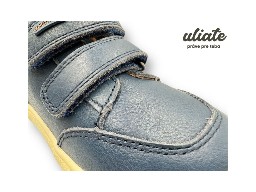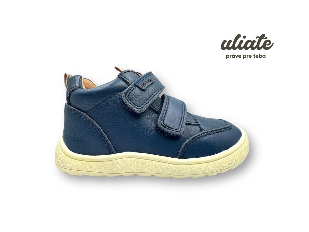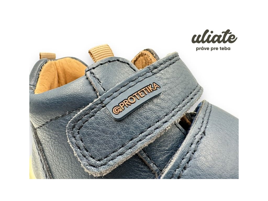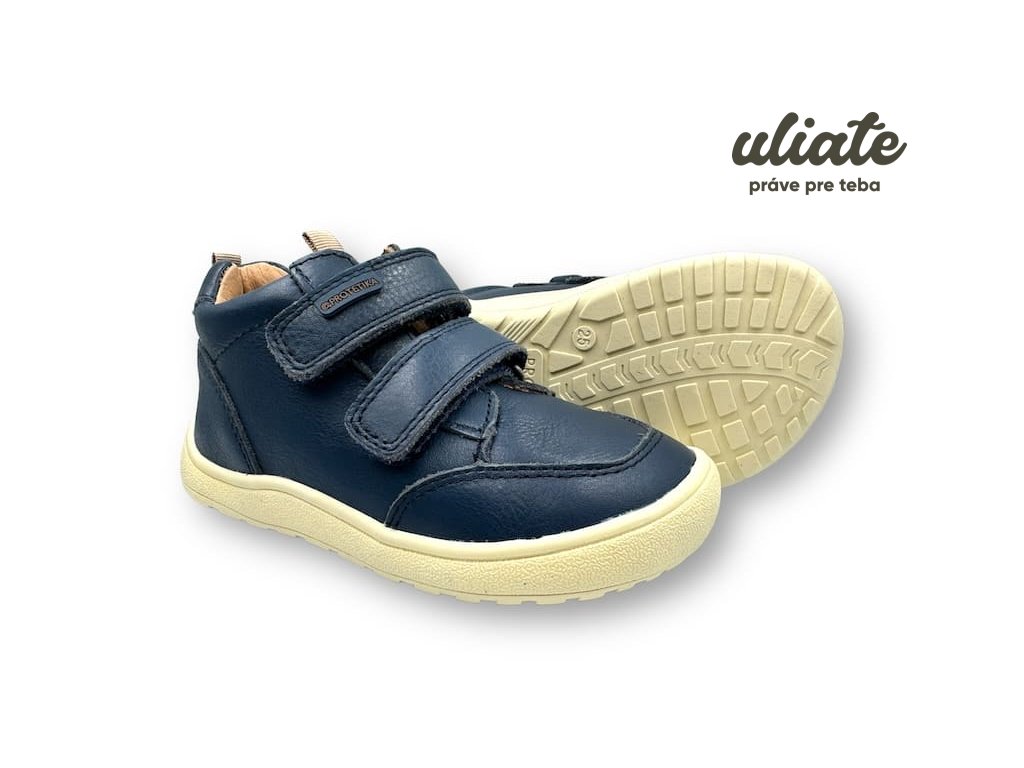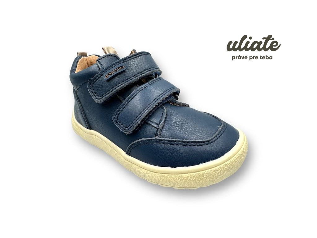 Protetika Deril Navy – kožené detské prechodné barefoot topánky s novou ohybnou gumenou podrážkou, nulovým dropom a 2× suchým zipsom; priestranná špička sadne ako uliata.