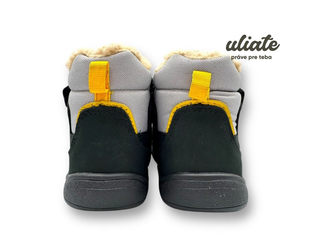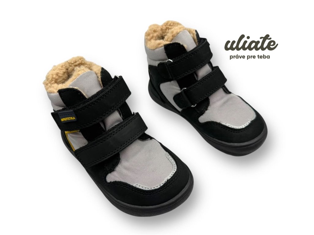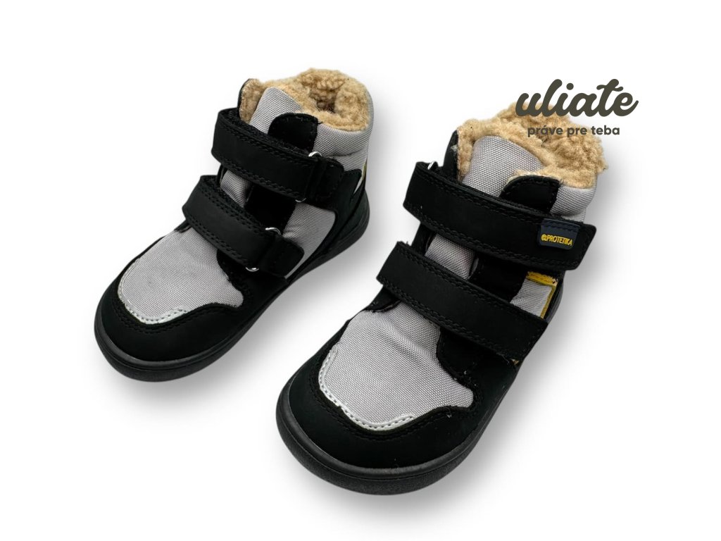 Zateplené zimné barefoot topánky s membránou PRO-TEX, hrejivou kožušinkou, zero dropom a ohybnou gumovou podrážkou. 2× suchý zips pre rýchle obúvanie a pevné dotiahnutie.