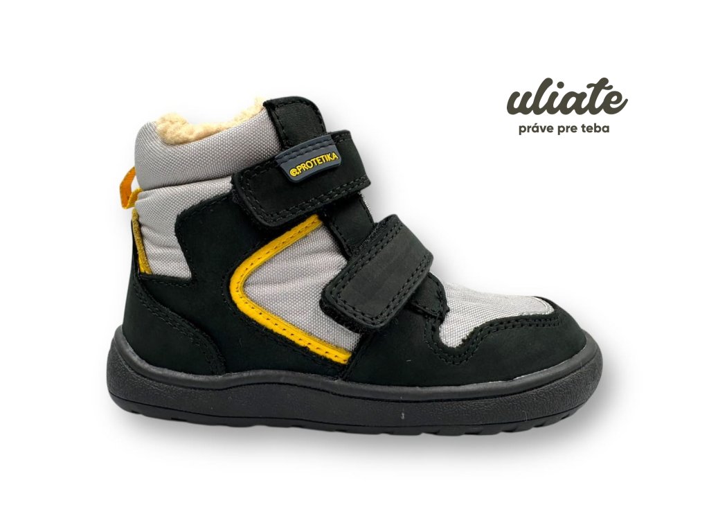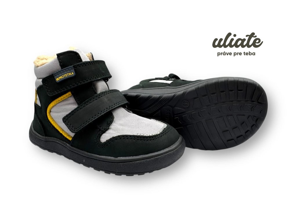 Protetika Gero Black (čierno-sivá so žltými detailmi) kombinujú brúsenú kožu, textil a PRO-TEX membránu pre lepšiu odolnosť voči vlhkosti. Vo vnútri je mäkká textilná kožušinka a rovná vyberateľná flísová stielka. Podošva je nová ľahčená guma – flexibilná priečne aj pozdĺžne s protišmykovým dezénom; špička je anatomická a dáva priestor aj dominantnému palcu. Vďaka membráne je podrážka pocitovo mierne tuhšia než bezmembránové modely.