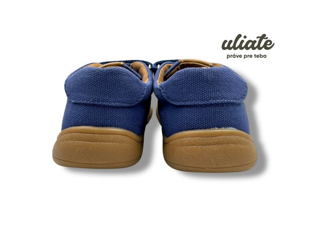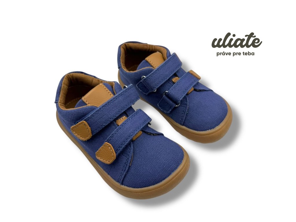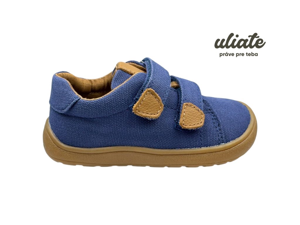 Priedušné plátené barefoot tenisky v odtieni Denim na jar/leto. Zero drop, široká špička, flexibilná gumená podošva a 2× suchý zips – rýchle obúvanie, voľnosť prstov a pohodlie celý deň.
