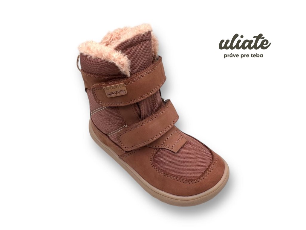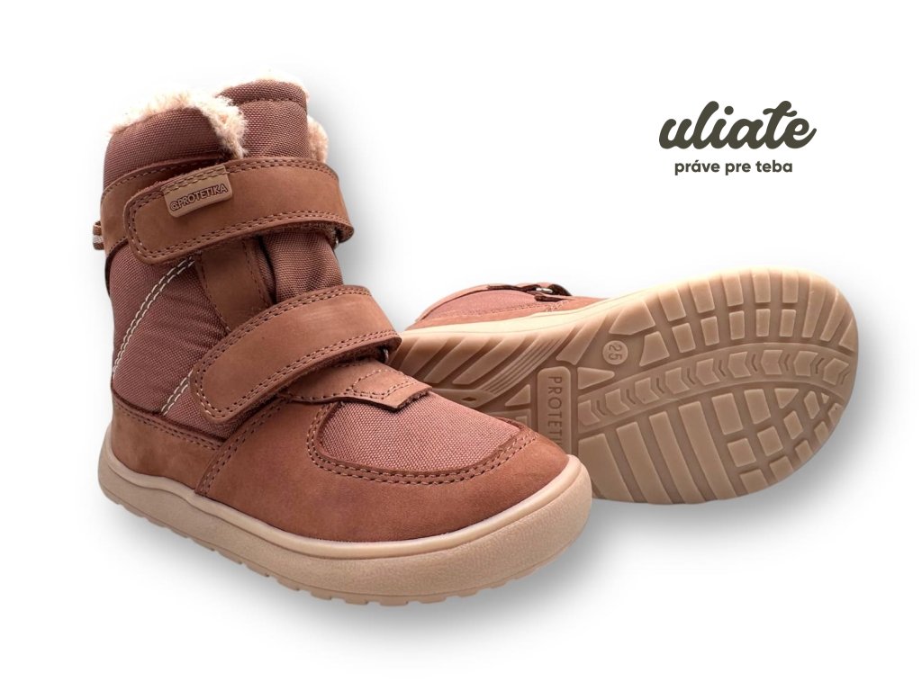 Zateplené zimné barefoot topánky s membránou PRO-TEX, hrejivou textilnou kožušinkou, zero dropom a ohybnou gumenou podošvou. 2× suchý zips pre rýchle obúvanie a isté dotiahnutie aj na užší členok.